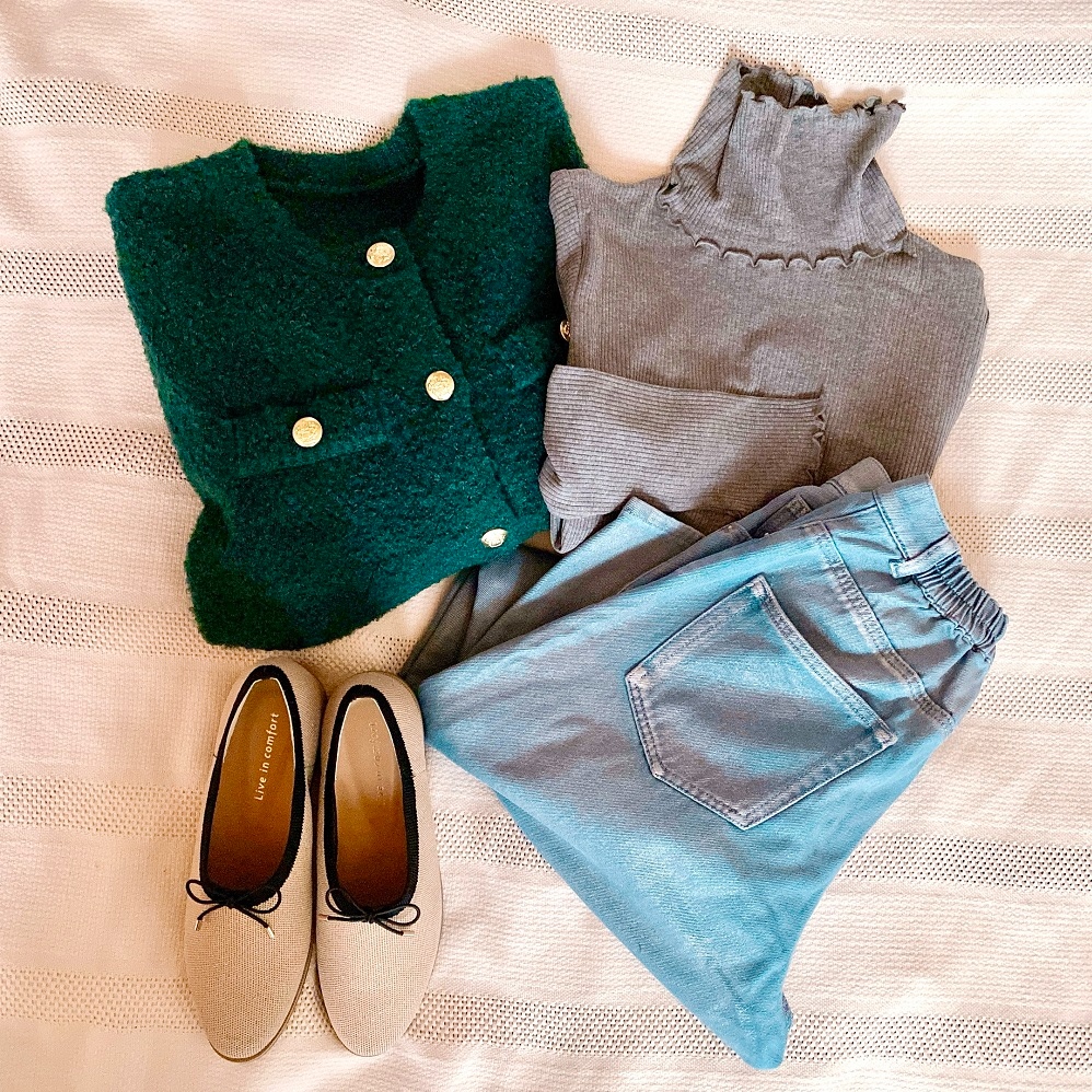 フェリシモ 夏の間お休みしていたフェリシモを再開!10月分定期便が届いた🎁・リブインコンフォート 洗えるニットアウター(グリーン)・リブインコンフォート 綿混素材のタートルネックリブカットソートップス・リブインコンフォート はまじとコラボ リボンニットシューティ・IEDIT 箔プリントゆるテーパードデニムパンツまだお昼は暑いけど、もうちょい涼しくなったら、このままこのコーデで出かけられそう😆