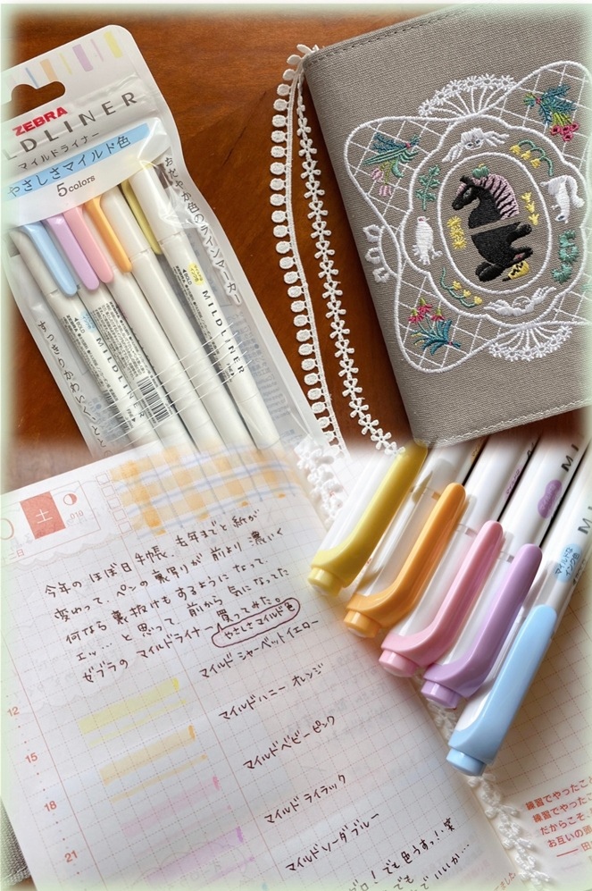 マイルド ほぼ日手帳用に、マイルドライナー買ってみた!ほんまにマイルド!ちょっと色薄いか?と思ったけど、手帳にはこれ位ほんのり色付けする方が、可愛いか。裏写りもゼロでストレスフリー!他の色も買い足そうかな?それにしても奥見伊代さんの手帳カバー、可愛いわぁ🥰見るたび嬉しくなる。しおりがレースリボンなのも、めっちゃ可愛いよね?